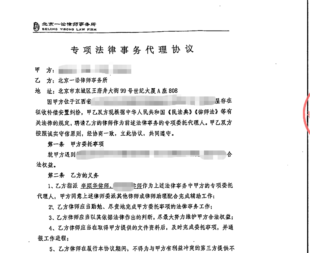 刘先生就江西吉安农村住宅征收拆迁维权事宜,经亲友推荐、深度咨询、律师充分研判维权可行性后,正式委托北京一讼律师事务所李顺华主任、郝建松律师,全权代理本案全部法律事务,特此公告。